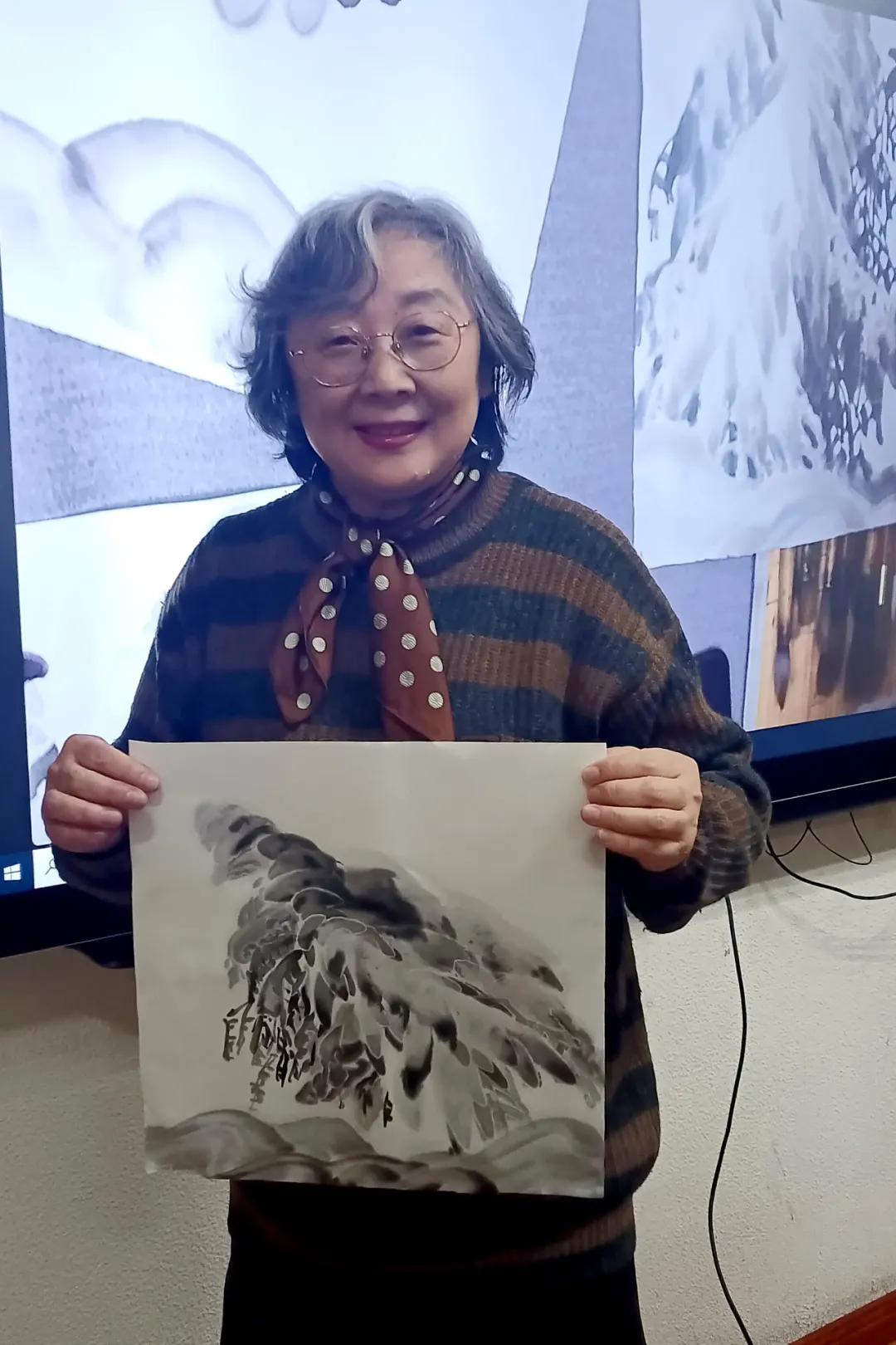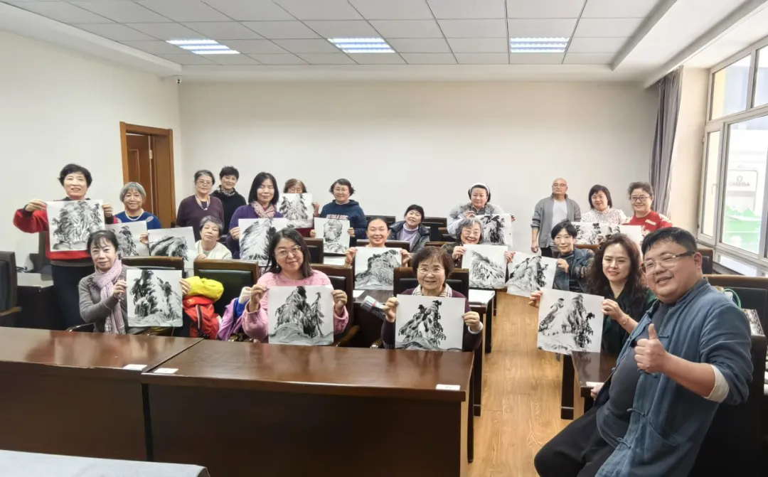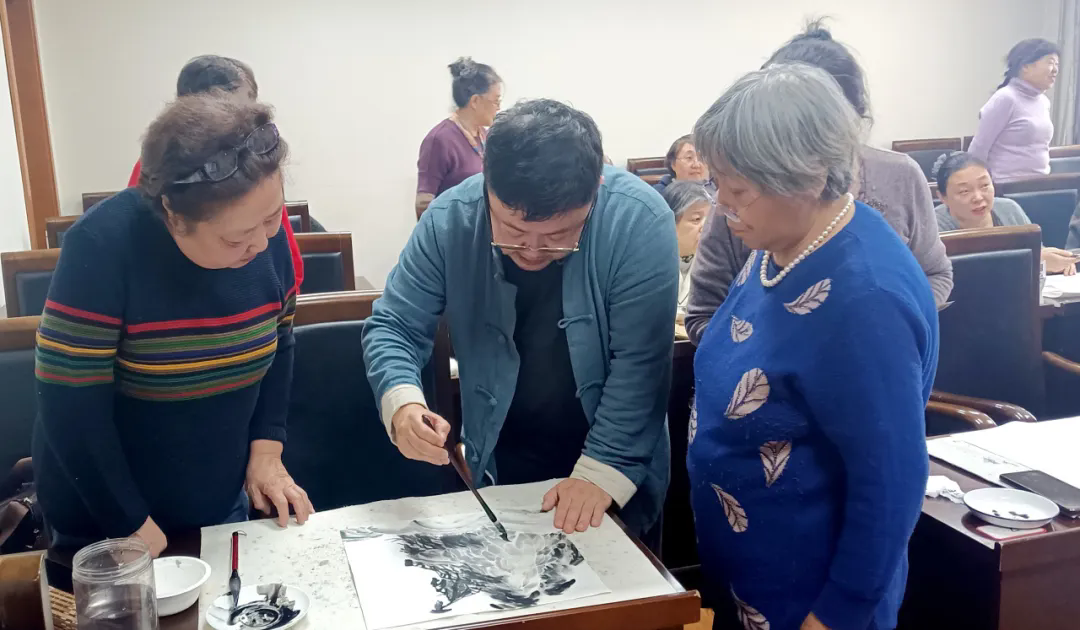 示范结束后,吴磊分组指导学员动手实践,一对一点评修改,把“课堂”变成“画坊”,把“示范”变成“共建”。短短两小时,20余幅习作完成“升级”,老同志争相与“新作”合影,纷纷表示要装裱好,或赠子女,或参展交流。