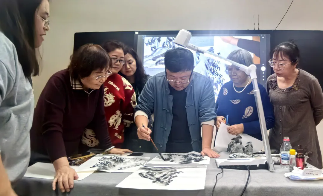 活动现场,省美术家协会理事、省文艺志愿者协会理事吴磊以《笔墨随时代 丹青写初心》为题,从构图、用笔、设色到题款,系统讲解中国冰雪画基本技法与创作要领,并现场示范创作《雪松迎春图》。20余名老年学员围拢画案,边听边记、边看边问,气氛热烈。72岁的学员许丽华兴奋地说:“第一次完整看到冰雪山水画的创作步骤,以前临摹总不得要领,今天豁然开朗,真切体会到‘老有所学’的快乐!”