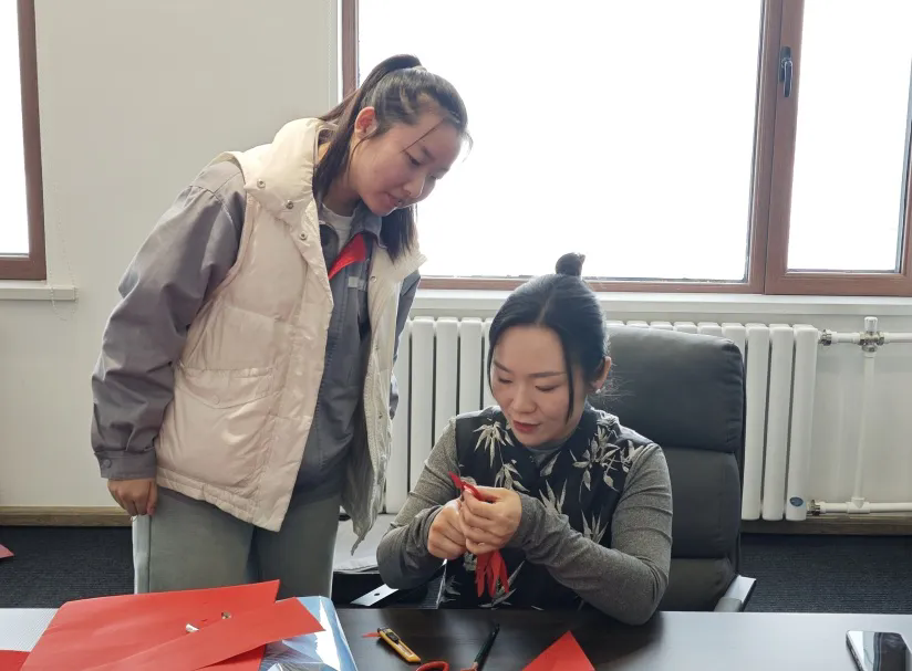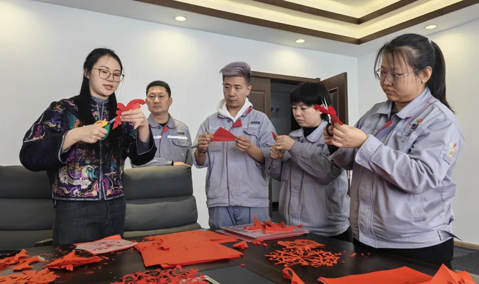 剪纸展示区也吸引了许多职工驻足。民间艺术家一边展示精巧剪纸技艺,一边讲解折纸与运剪的技巧。在她的耐心指导下,大家纷纷动手尝试,虽动作生疏,也逐渐剪出了红彤彤的“福”字与雪花图案。成功完成作品的职工举起窗花笑道:“这个年,家里窗户就贴它了!”大家更是举着自己的作品拍照留念,现场洋溢着浓浓的成就感与节日氛围。