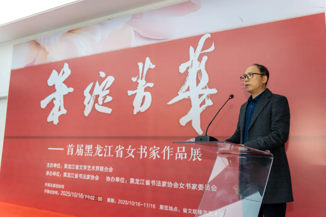 蔡兴洲在致辞中表示,书法艺术作为中华文脉的重要载体,承载着中华民族的精神基因与文化密码。黑龙江省的女书家群体以其独特的艺术感知力,成为这片文化沃土上最富灵气的“笔墨使者”。她们坚持以人民为中心的创作导向,以笔墨为桥,深耕碑帖经典,从篆隶楷行草的法度中筑牢笔墨根基,展现出对中华优秀传统文化的坚定传承。同时,她们扎根黑土文化,将龙江大地的林海松涛、江河壮阔与冰雪晶莹等自然意象,融于笔势墨韵之中,使作品既具有传统书法的风骨,又洋溢着浓郁的地域气息。作为我省首个女书家届展平台,本次展览不仅是对她们艺术成果的集中呈现,也是一次重要的交流与互鉴。展出的百余件作品,既体现了作者扎实的艺术功底,也传递出她们对生活、对文化、对时代的深刻感悟与热忱表达。