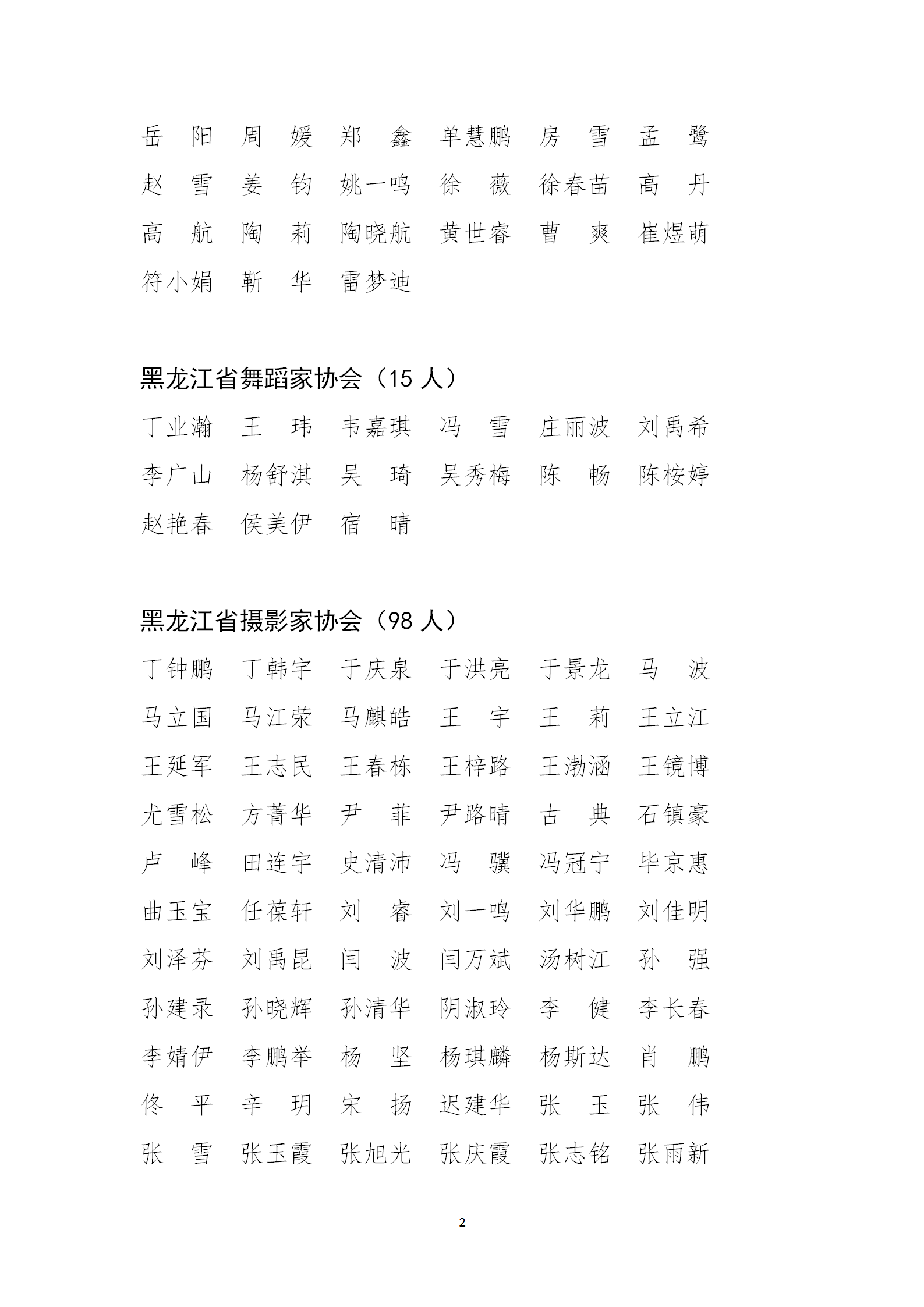 2025年下半年黑龙江省戏剧家协会、音乐家协会、舞蹈家协会、美术家协会、摄影家协会、书法家协会、曲艺家协会、民间文艺家协会、文艺评论家协会入会申报审批工作已经结束。根据相关协会章程及个人会员入会细则有关规定,经相关会议研究、按流程严格审核,共确定797名申报者为2025年第二批拟入会人员,现进行公示,名单如下。